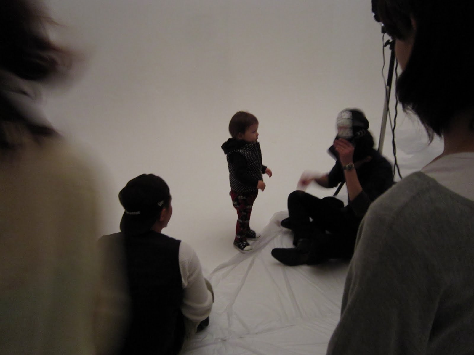 Igen ám, de volt ugye egy kislány is. Ő valahogyan háttérbe szorult. Amikor sapkát adtak rá, az anyukája győzködte, hogy esik most az eső és sapka kell. Anyuka egyedül győzködte. Ekkor éreztem magam először igazán kényelmetlenül, mert míg a kislánnyal az anyukája egyedül küzdött, addig mi Hibikinek a közelébe sem jutottunk, mert mindenki vele foglalkozott. Táncoltak, énekeltek neki, a fotós hagyta, hogy az i-phone-jával játszon, sapkát húztak mindannyian a kedvéért és még sorolhatnám. sőt a nagyobb gyerekek (két fiú és két lány) anyukái is végignézték Hibiki „szereplését”. Azonban mikor Hibiki végzett és csak a kislány maradt a teremben, mindegyik anyuka és a stáb nagyja is elhagyta a termet. Sajnos érezni is lehetett a kislány anyukáján, hogy nem tetszik neki a helyzet, de ezzel Hibikinél sajnos szembe kell néznünk, mert nagyon előadja magát. Rohangál fel s alá, magyaráz megállás nélkül, mindenkivel haverkodik, mindent kíváncsian megnéz, megbütyköl (még a stúdió zenéjét is leállította, egymaga) és mindezt széles mosollyal. A kislány pedig anyukája mögé bújva várt, néha kicsit előjött Hibiki után, sőt simogatta Hibikit, aki cserebe adott neki egy kisautót.