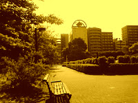 A kis sétány a pázsittal, bokrokkal, a felhőkarcolók tövében, a folyóparton volt, nagyon hangulatos, kellemes volt ott sétálni.